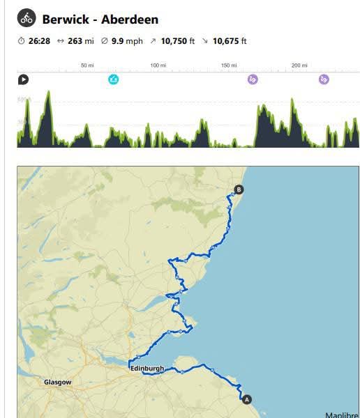 It was a pleasant ride to Stonehaven—then things got a bit pear-shaped. Cycling into Aberdeen seemed to take forever! But eventually, I arrived in the Granite City: 263 miles in total, and still smiling.