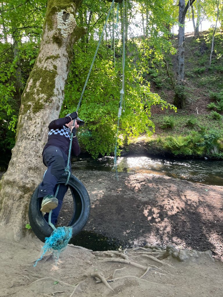 When he spotted a rope swing hanging from a tree and launched himself onto it, none of us had the urge to follow, but we cheered him on as he swung high into the air, a big grin on his face.