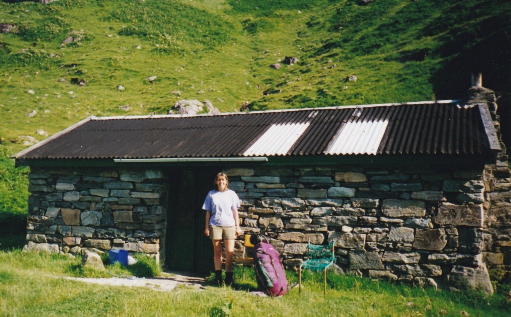 I must have had a camera, because I’ve found two photographs to share in this post – how times have changed! This one taken outside Sourlies Bothy shows me with my pack.