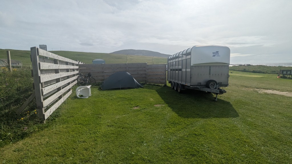 I was greeted by the owner, Donald, who was clearly concerned about me staying in my tent. He said he had an idea. Oh good, I thought, assuming he was about to offer me something solid and enclosed. His solution, it turned out, was to park a sheep trailer in front of the pitch. Oh well. Hopefully that would do the job. I did move the plastic chair from the pitch. Safety, and all that.
