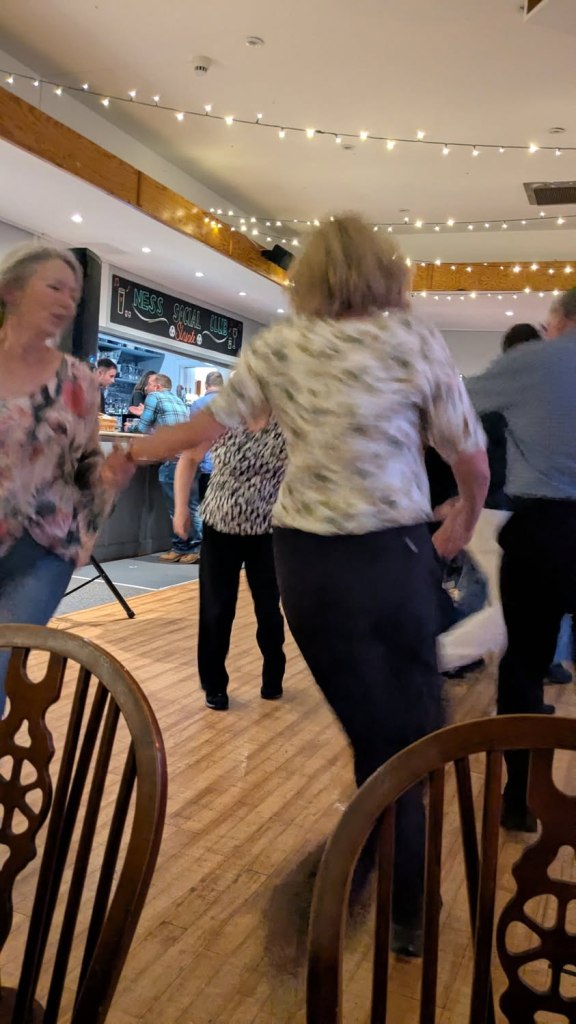 After a walk around the headland, I headed back to Ness township and found my way to Philly’s house. She invited me to join her for her daily swim at Ness Beach, where we met up with some of her friends for a dip in the cold Atlantic. It was exhilarating, and it made me wish I were brave enough to swim when I’m on my own but, sadly, I don’t seem able to do that without a bit of encouragement. Invigorated, we returned to Philly’s house, where I took forty winks before we headed out to the ceilidh. It was great fun!