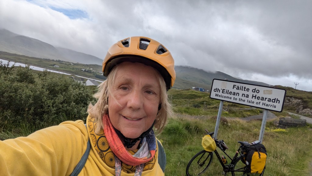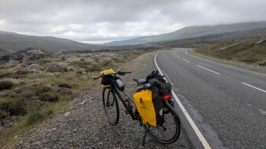 Shortly after passing the sign welcoming me to the Isle of Harris, I reached the Scaladale Outdoor Centre. Thankfully, they let me top up my bike’s battery again, as I could see the road winding upwards and around the flanks of Clisham, the highest mountain in the Outer Hebrides. Once rested, I set off with trepidation, but it wasn’t actually that bad, just a steady pull up. Unfortunately, I rode straight into mist and missed out on what I imagined must have been fabulous views. Still, it was a pleasure to take advantage of the freewheel down into Tarbert.